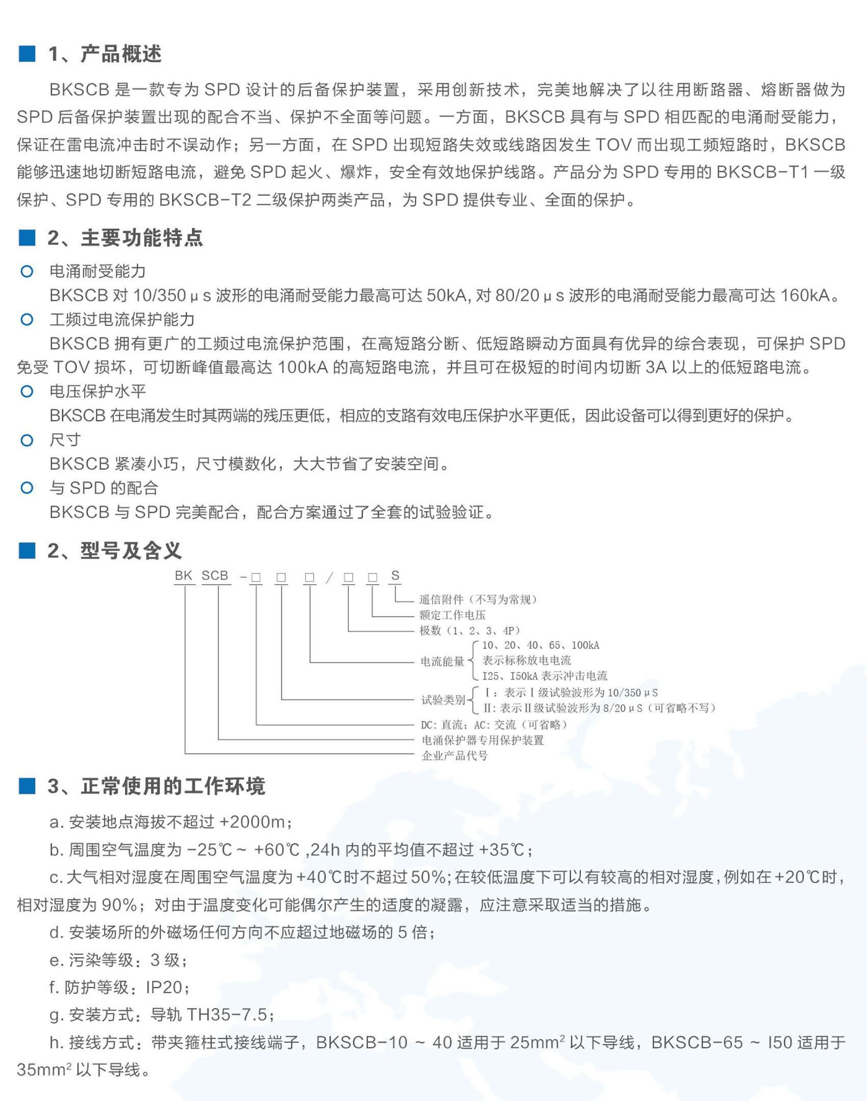 BKSCB系列电涌?;て髯ㄓ帽;ぷ爸檬视糜诮涣?0Hz/60Hz、额定工作电压至400V,需安装SPD(防雷保护器)设备的电路中,为试验类别为Ⅰ类和II类的电涌?;て魈峁┳ㄒ档暮蟊副;?。本产品符合NB/T 42150标准。